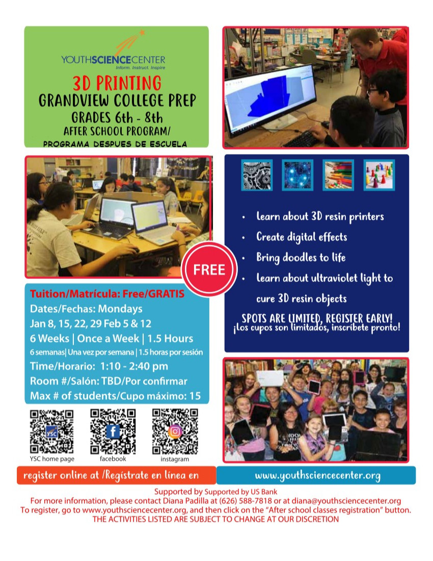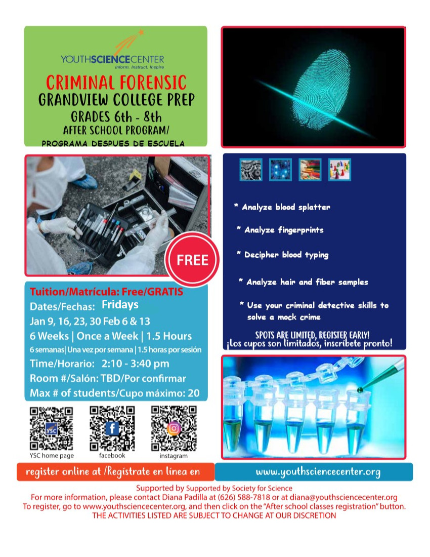 For more information, please call Diana at 626-588-7818 or email at diana@youthsciencecenter.org