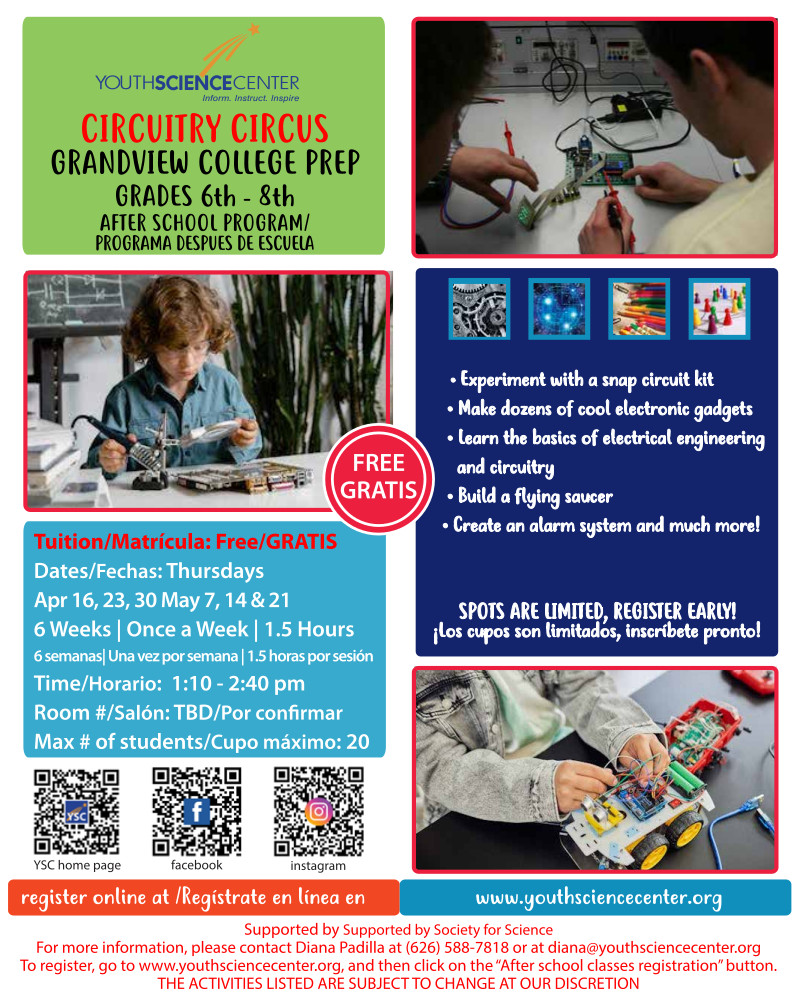 For more information, please call Diana at 626-588-7818 or email at diana@youthsciencecenter.org